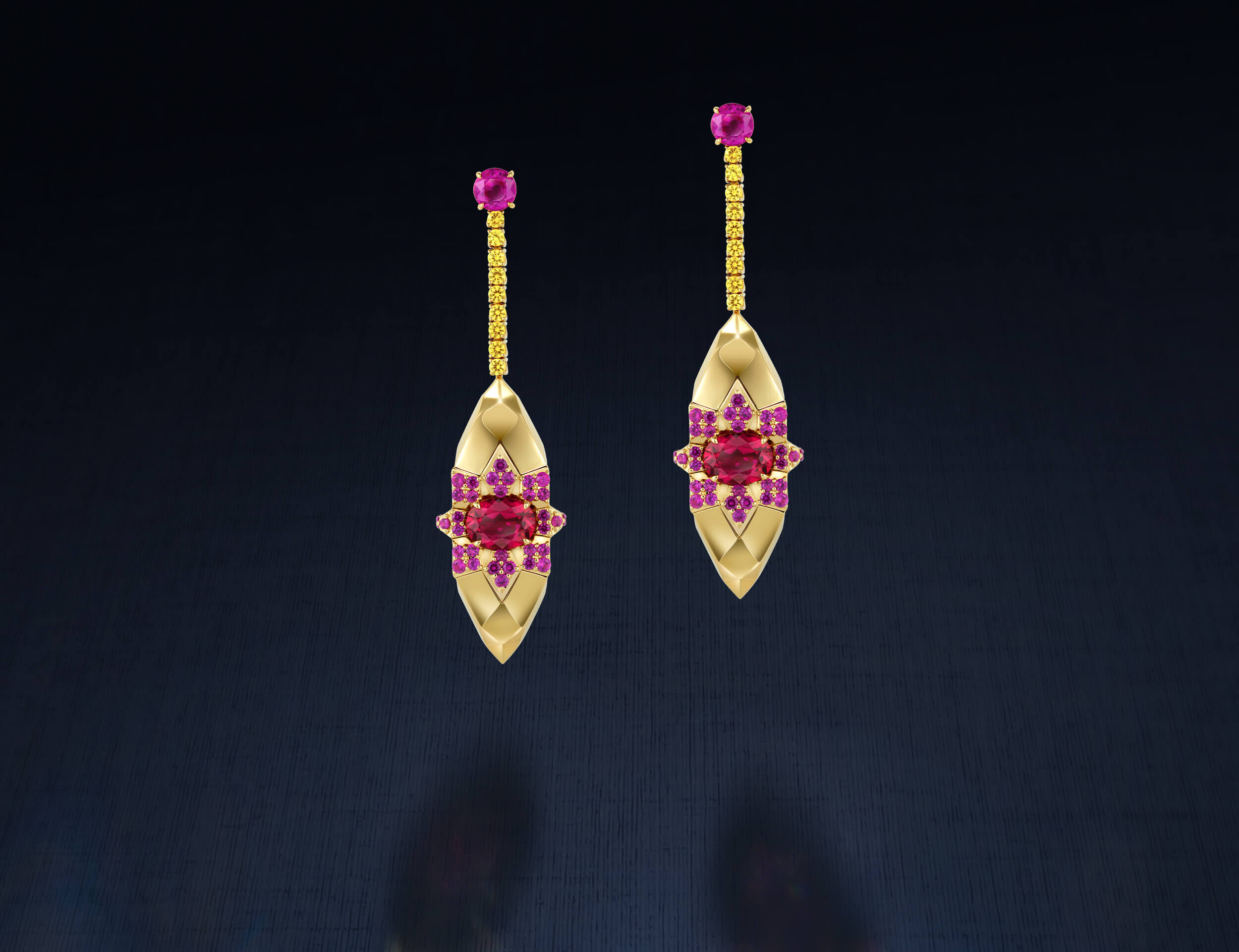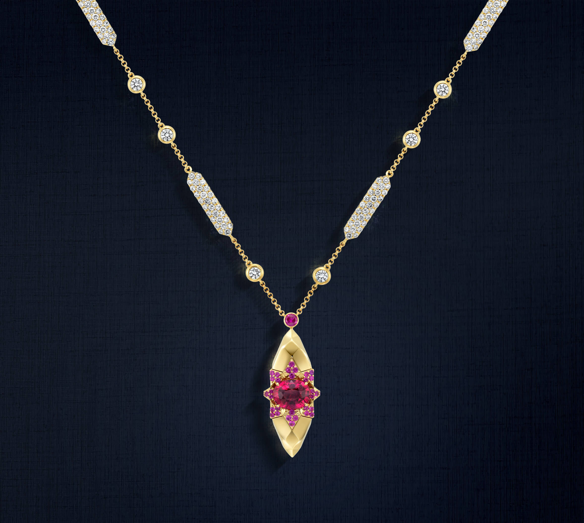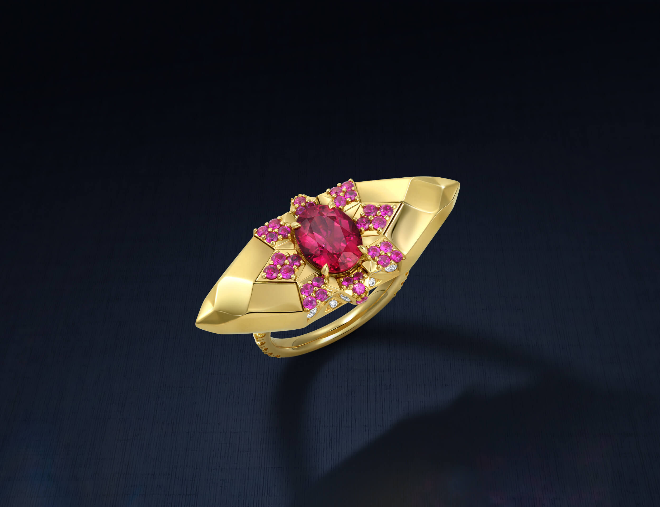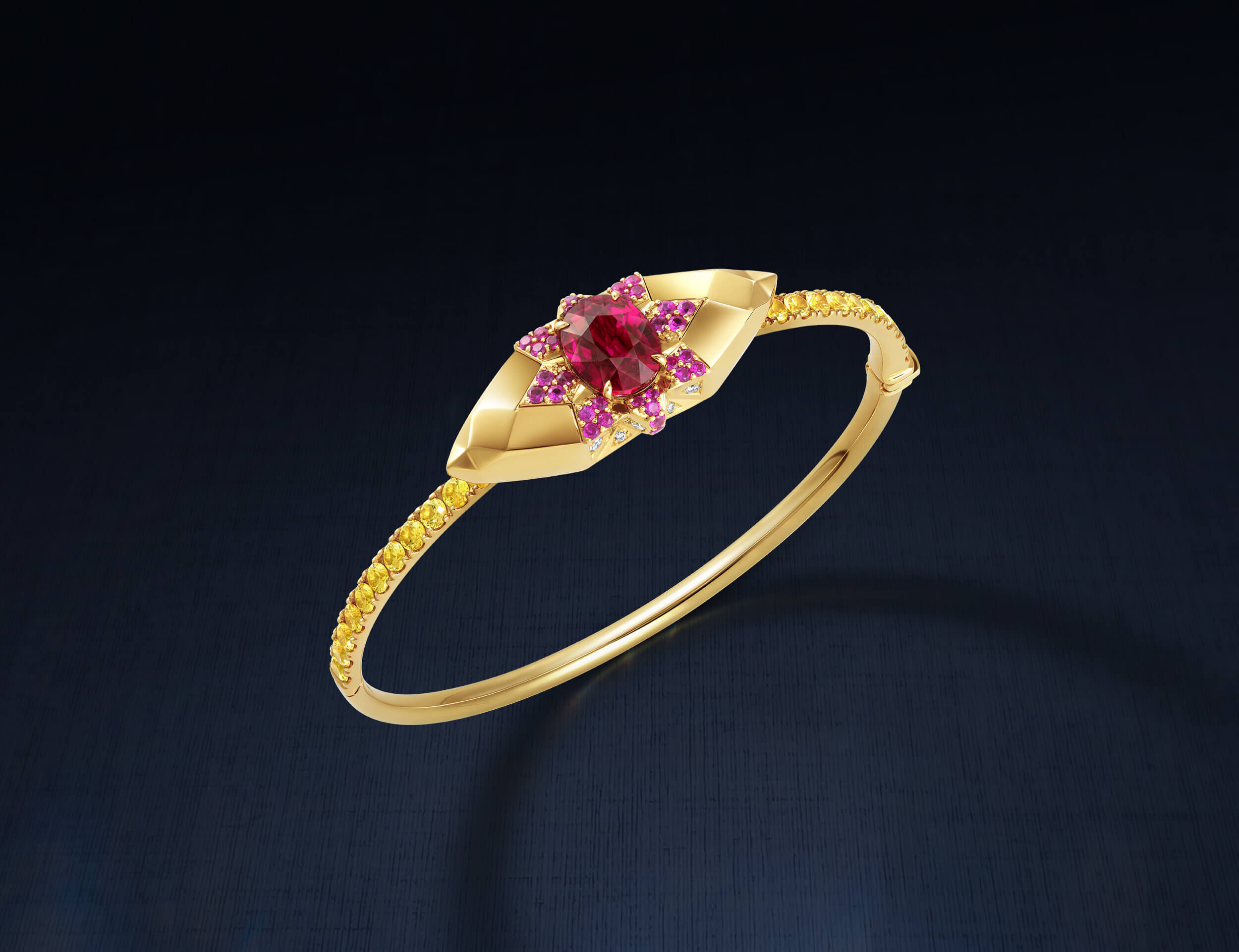 Beneath Petra’s rose-red cliffs, a central stone glows like the twilight sun. Pink and yellow sapphires capture sunset hues, while rubellite reflects the city’s warm glow. Handcrafted with gold and diamonds, this masterpiece turns legendary architecture into timeless beauty.