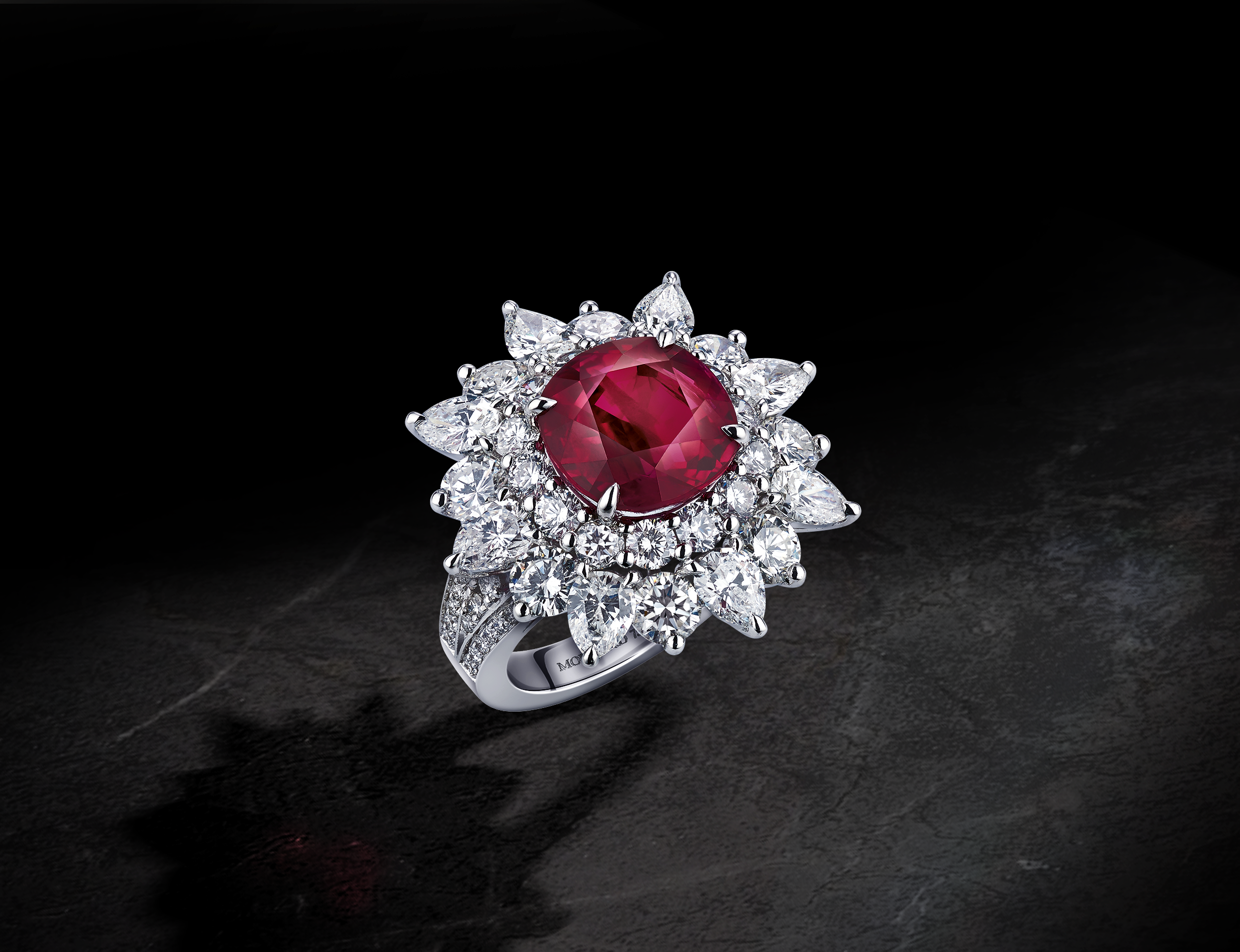 Beyond the inspiration, the design played on the opulence of materials and the radiance of light. The intense hues of the rare rubies chosen as center stones created a dazzling contrast of color that further enhanced the dramatic feel. These fiery gems were also painstakingly mounted on classic prong settings that gave them greater prominence and improved their light performance. Ultimately, each piece of the Imperial Desire was refined to give way to a new emotion: from the interlaced lavish backdrop of diamonds to the vivid rubies trickling down.
