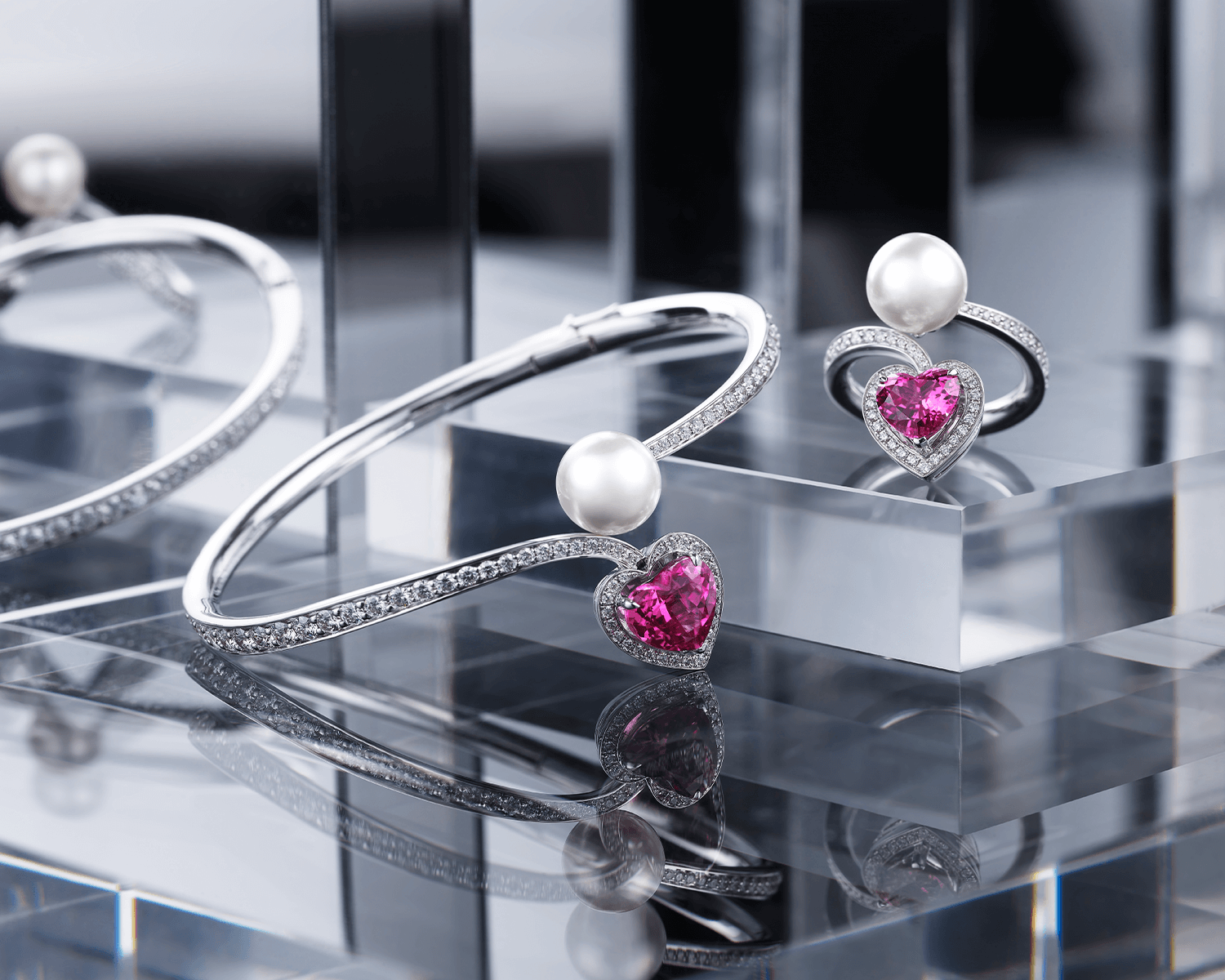 A vibrant rubellite heart stands as a monument to a woman's profound emotional depth. Adorned by a white pearl and complemented by white diamonds, this union is a tapestry of strength interwoven with purity, reminiscent of Venus's seamless interplay of passion and grace.